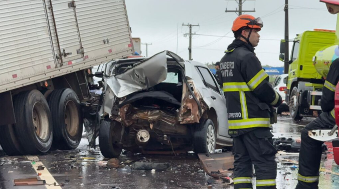 Bombeiros socorrem vítimas de colisão frontal entre veículos na BR-070