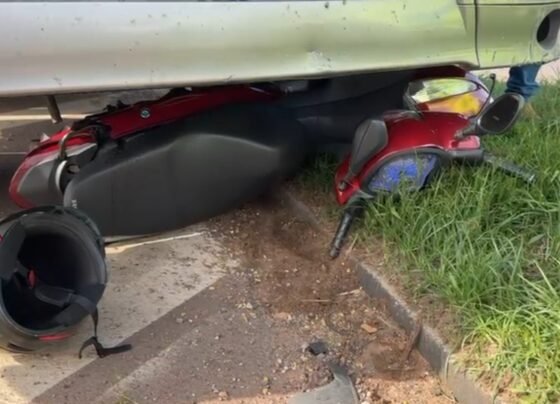 Mulher escapa por pouco após moto ser arrastada por caminhão na BR em Sinop