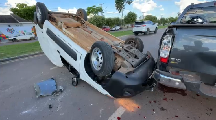 Colisão em Sinop: Fiorino capota após bater em caminhonete e outro carro estacionados