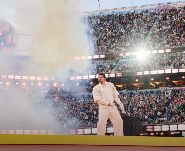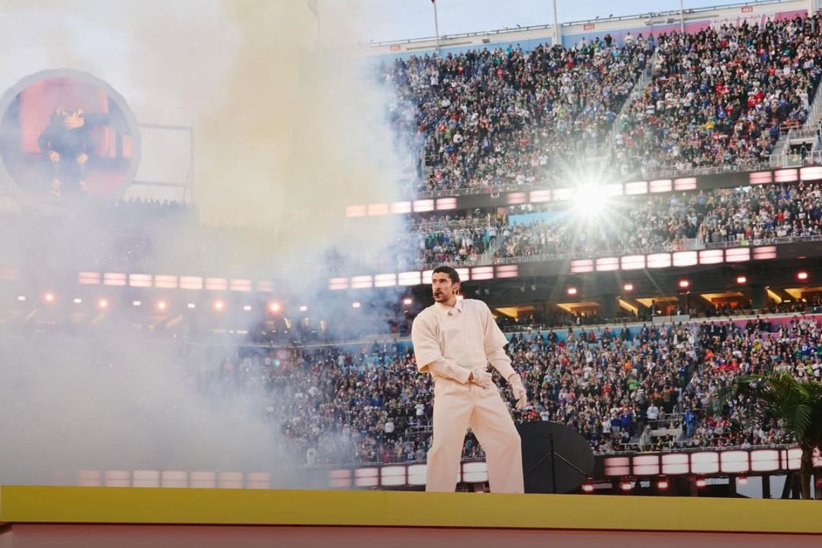 O show de Bad Bunny teve cerca de 13 minutos e foi inteiramente cantado em espanhol. O cenário fez referência ao álbum “Debí Tirar Más Fotos”, vencedor do Grammy de Melhor Álbum. A apresentação começou em uma plantação cenográfica, ao som de “Tití Me Preguntó”, repleta de elementos da cultura latina, como a encenação de um casamento, que emendou com “Yo Perreo Sola”.