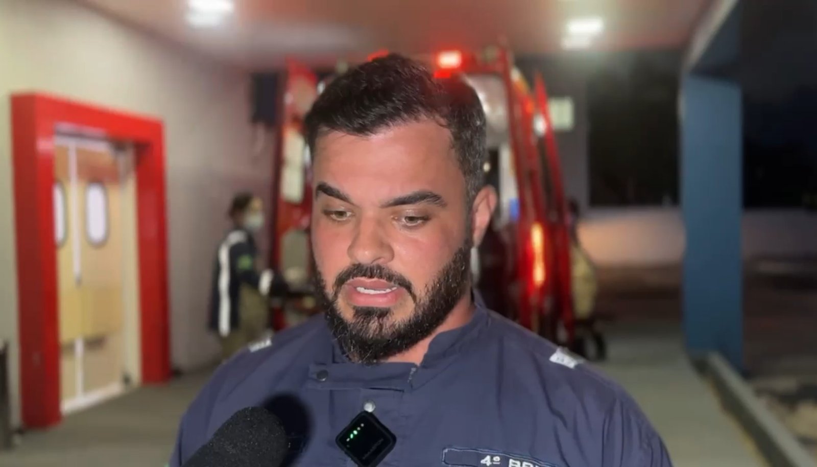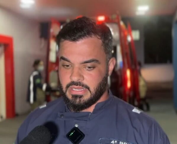 “Atendemos uma queda de nível, vítima de 50 anos, acabou caindo de mais ou menos um metro, batendo as costas na região da coluna torássica e uma queixa de bastante algia no local, uma redução de força das pernas”, “um trauma raquimedular baixo, mas é um diagnóstico prévio, claro, precisa da imagem para confirmar, mas lúcido, consciente, orientado, graças a Deus, ele fez um transporte sem intercorrência, vítima com analgesia, relata a melhora da dor e entrega aos cuidados da equipe do regional”, relatou o médico socorrista Alef, do Corpo de Bombeiros.