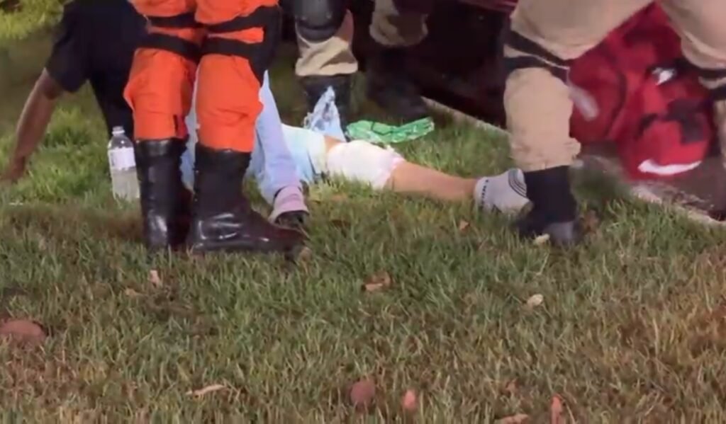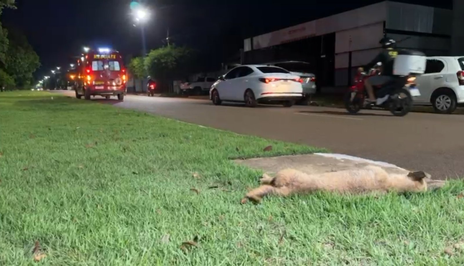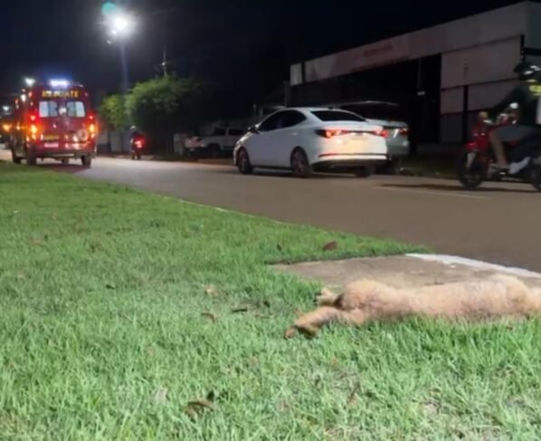 O motociclista atropelou o animal e caiu. O rapaz ficou ferido e foi socorrido pelo Corpo de Bombeiros. O cachorro morreu no local.
