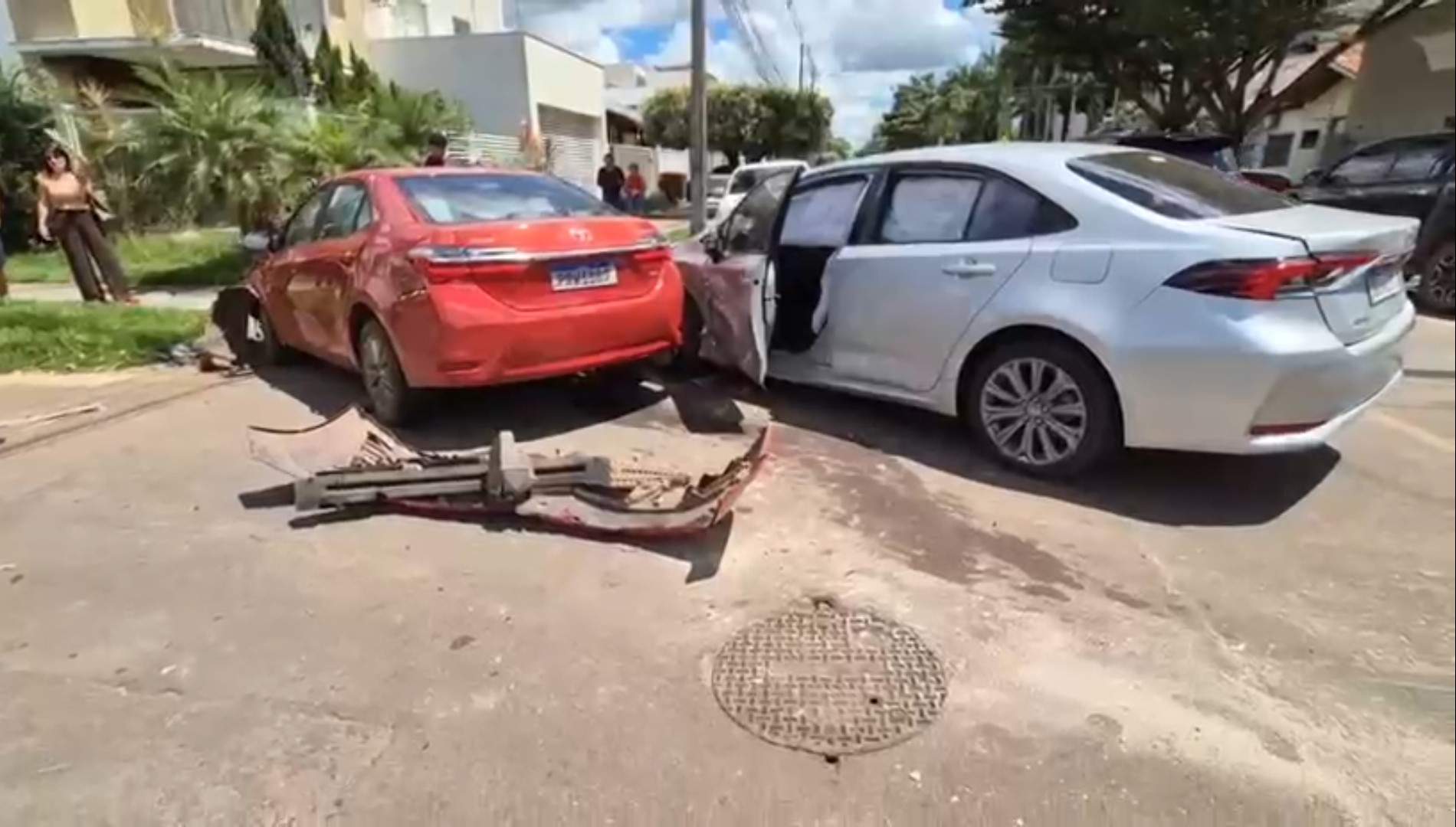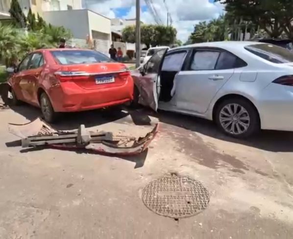 O segundo acidente, registrado na rua das Camélias com ruas das Tamareiras, no bairro Jardim Maringá, foi no sábado (11). O Toyota Corolla vermelho seguia pela Tamareiras e teve a preferencial cortada por outro Corolla, cor prata.