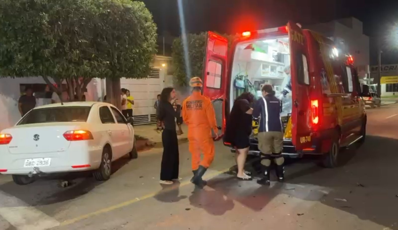 Uma senhora gestante ficou dentro do carro Voyage, de cor branca, e foi socorrida pela equipe do Corpo de Bombeiros que a encaminhou à unidade hospitalar. Pelo local, ficaram estilhaços e marcas da batida. A vítima ficou um tanto quanto desorientada, mas consciente.