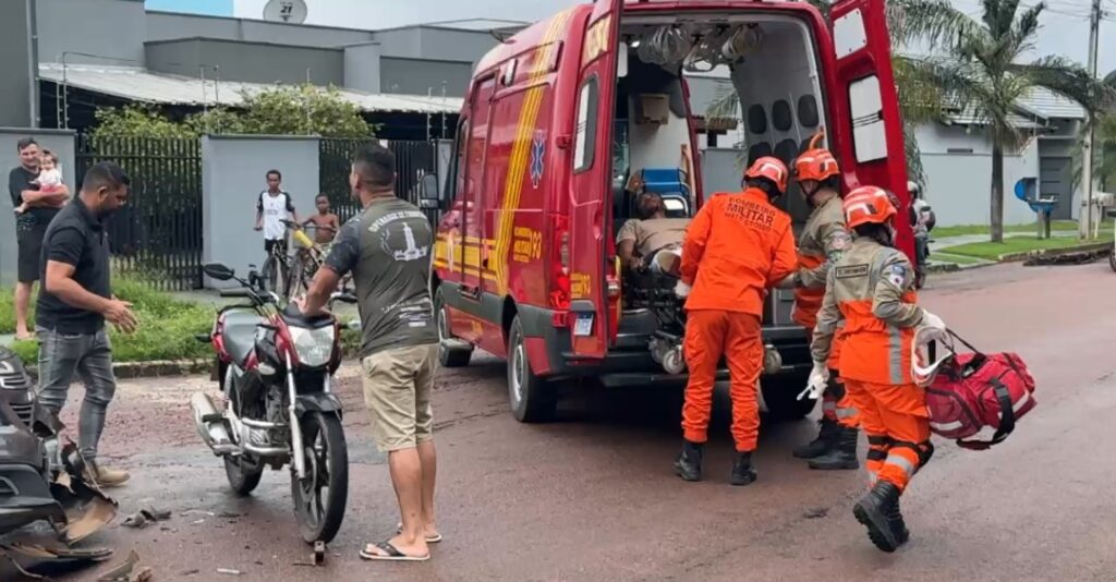 O impacto foi forte – o condutor da moto chegou a ficar sobre o veículo e foi atendido pelo Corpo de Bombeiros, que desceu ele do carro.. O motorista do carro estava indo para o trabalho. Os dois condutores permaneceram no local.