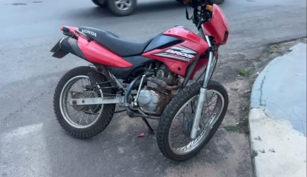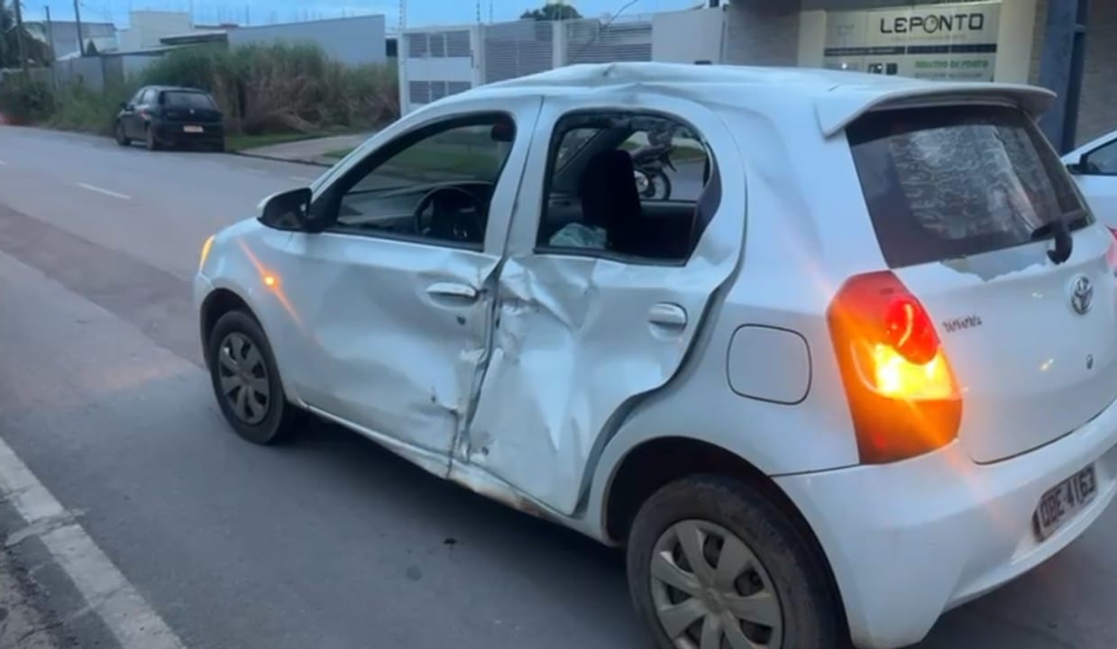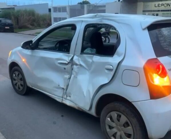 A vítima caiu quase dentro de um valetão. O impacto foi forte e o Etios de cor parta teve a lateral foi danificada e pegou as duas portas. A motocicleta também foi danificada, com a frente destruída.