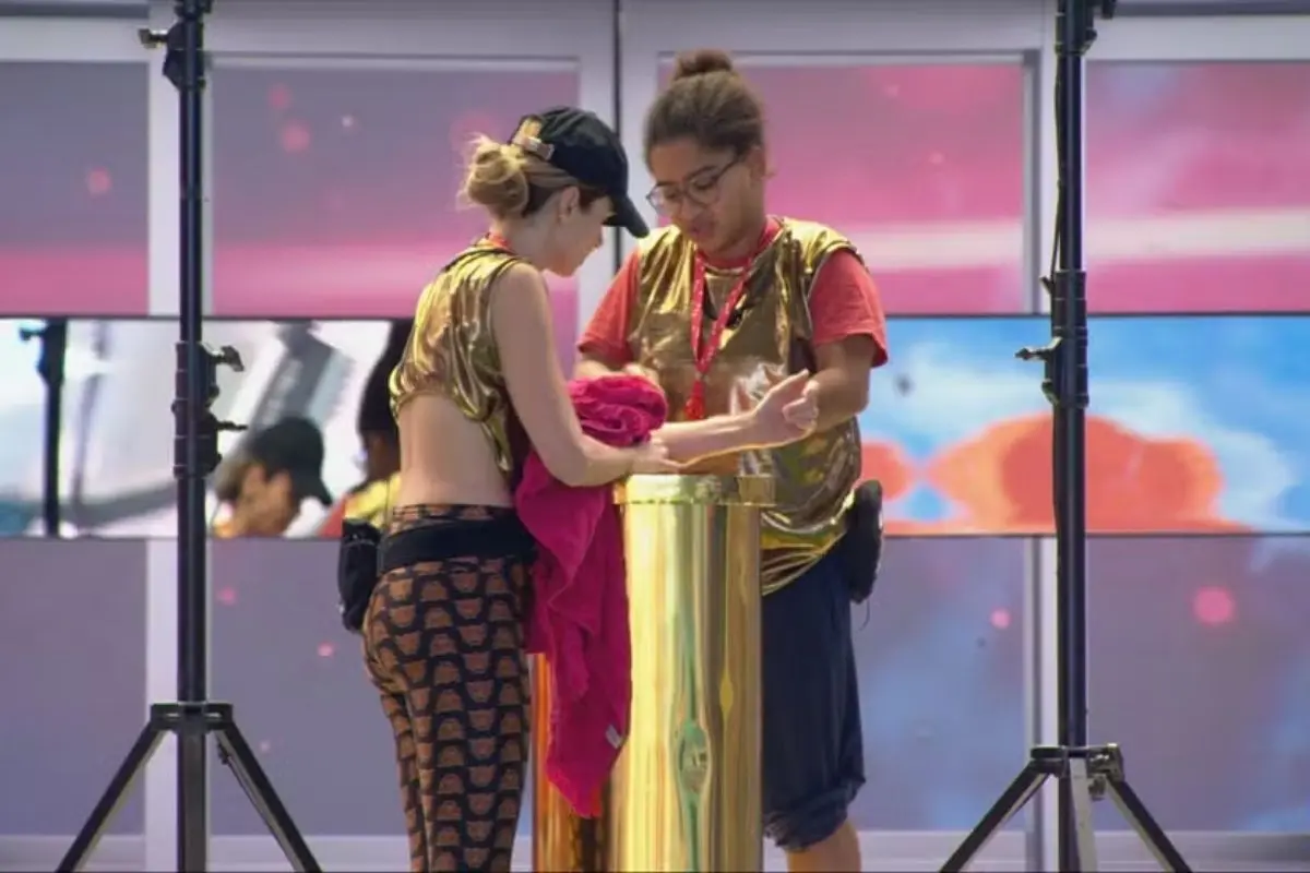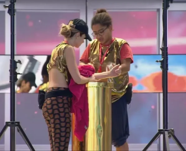 “Atenção, Ana Paula e Milena. O Monstro está temporariamente suspenso”, diz a voz. Neste momento, era Milena quem estava no botão, localizado na área externa. A sister deixa o espaço após o aviso.