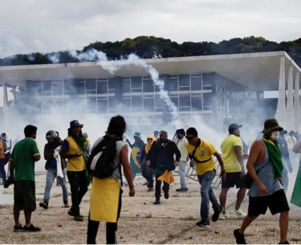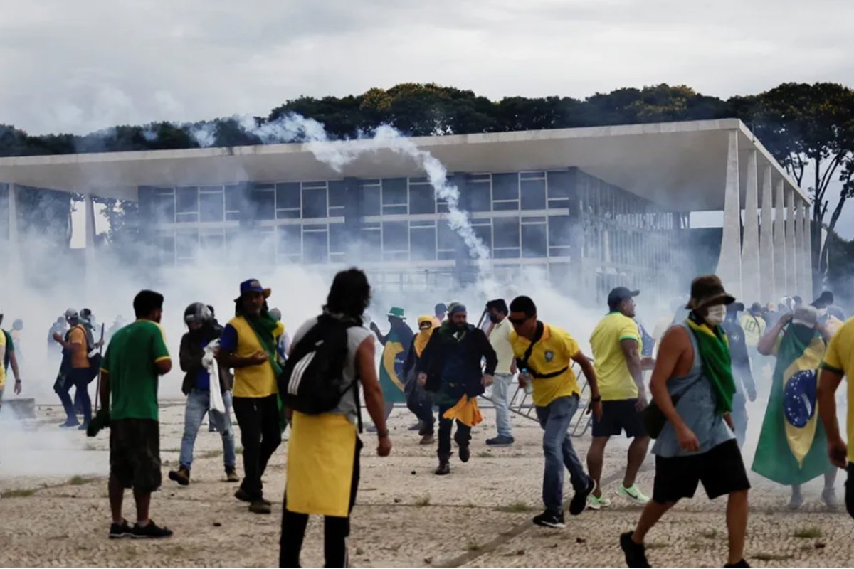 Criminosos ocupam a Praça dos Três Poderes em meio à fumaça, reprimidos pela polícia em Brasília, em janeiro de 20 (Foto: Ueslei Marcelino/Reuters).
