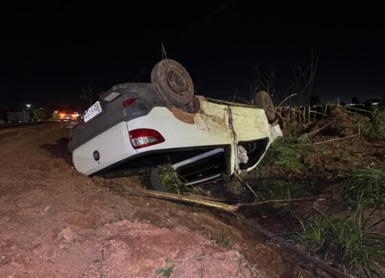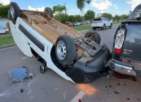 Colisão em Sinop: Fiorino capota após bater em caminhonete e outro carro estacionados