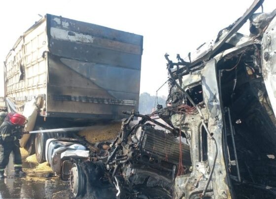 Corpo de Bombeiros combate incêndio em carreta após colisão de veículos em rodovia