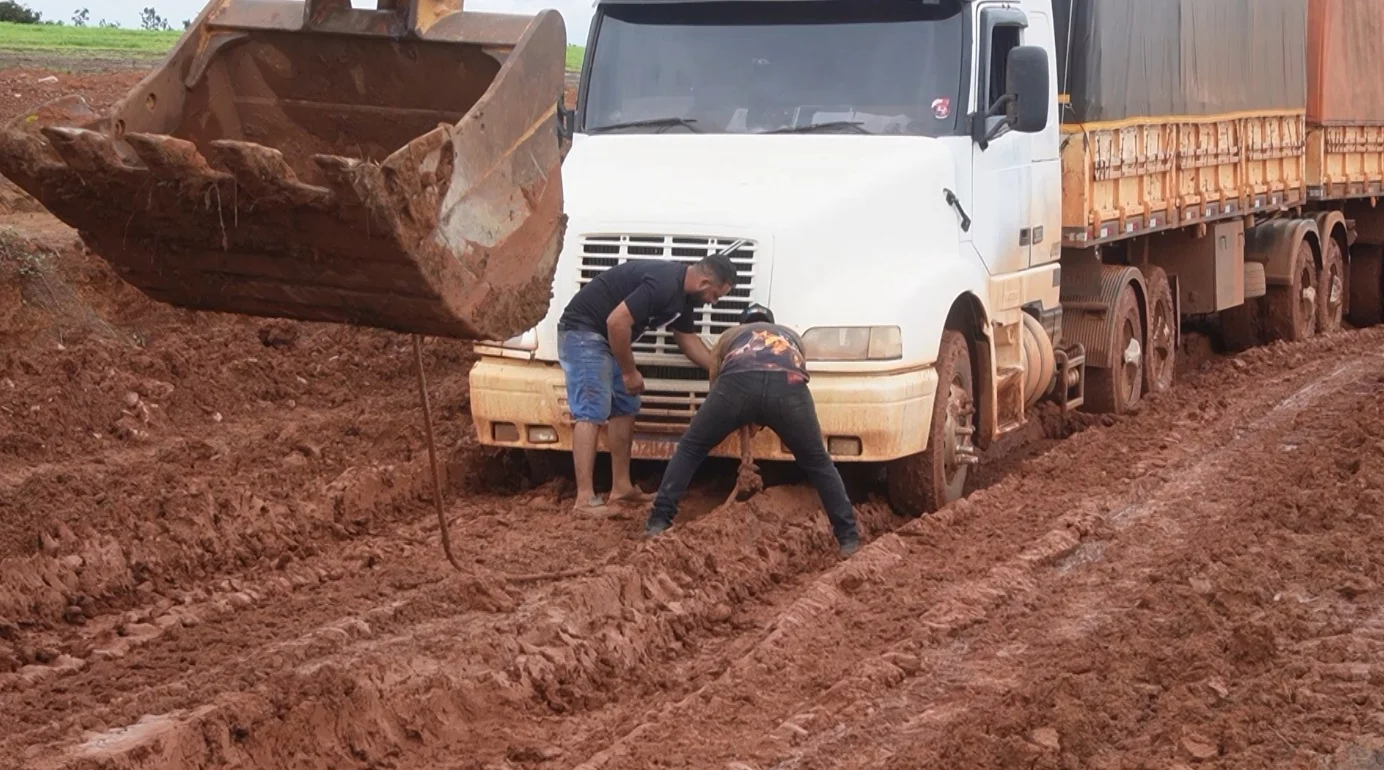 A falta de transporte mantém máquinas paradas nas lavouras e atrasa a colheita, o que ameaça a produtividade da soja na reta final. Em um intervalo de apenas 40 quilômetros, o cenário é marcado por atoleiros, prejuízos e longas filas de veículos encalhados no barro.