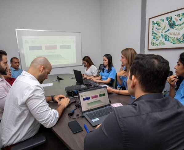 A foto ilustra um conjunto de servidores públicos prestando atenção numa tela. O ambiente remete a uma sala de escritório.