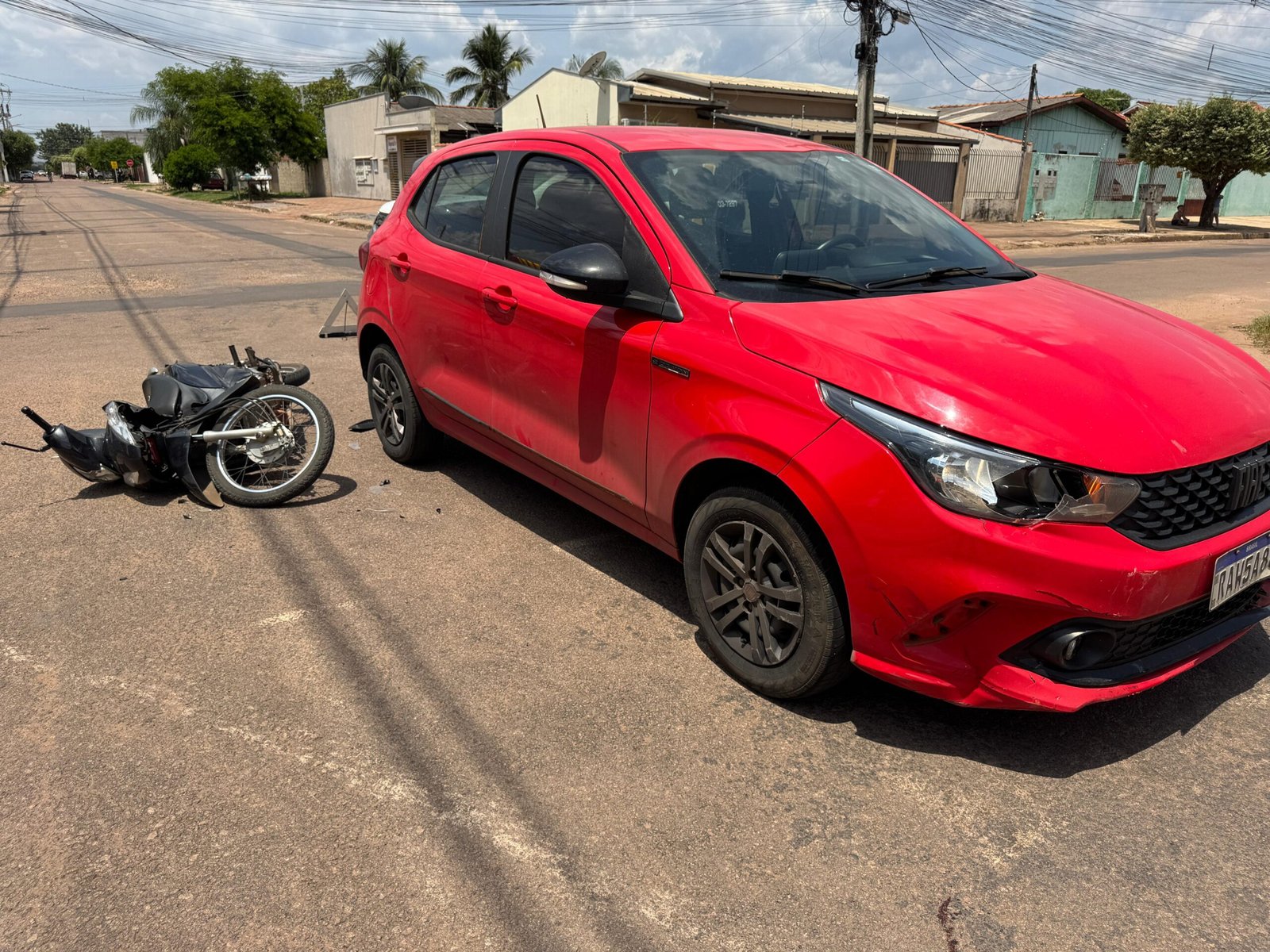 No Jardim Imperial, cruzamento das Margaridas com Açaís, outro acidente entre carro e moto nesta segunda-feira (27). A equipe do Corpo de Bombeiros foi ao local para fazer o atendimento. Uma colisão entre o veículo Argo de cor vermelha e a motocicleta Honda Abyss que ficou bem danificada.