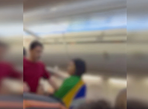 Vídeos obtidos pelo portal Metrópoles mostram a mulher enrolada em uma bandeira do Brasil e proferindo ofensas contra outros passageiros. “Estuprador, abusador, aliciador, assediador”, disse.