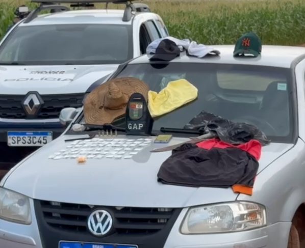 Em seguida, os militares receberam novas informações acerca da localização dos suspeitos, que estariam escondidos em uma propriedade rural, sendo abordados e detidos. A dupla e todo material apreendido foram encaminhados à delegacia para registro do boletim de ocorrência.