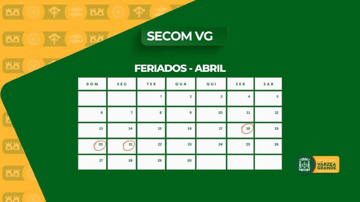 A Prefeitura de Várzea Grande divulga que não considerará esta quinta-feira (17) como ponto facultativo. O expediente no poder público municipal ficará suspenso somente na Sexta-Feira Santa (18) e na segunda-feira dia de Tiradentes (21).