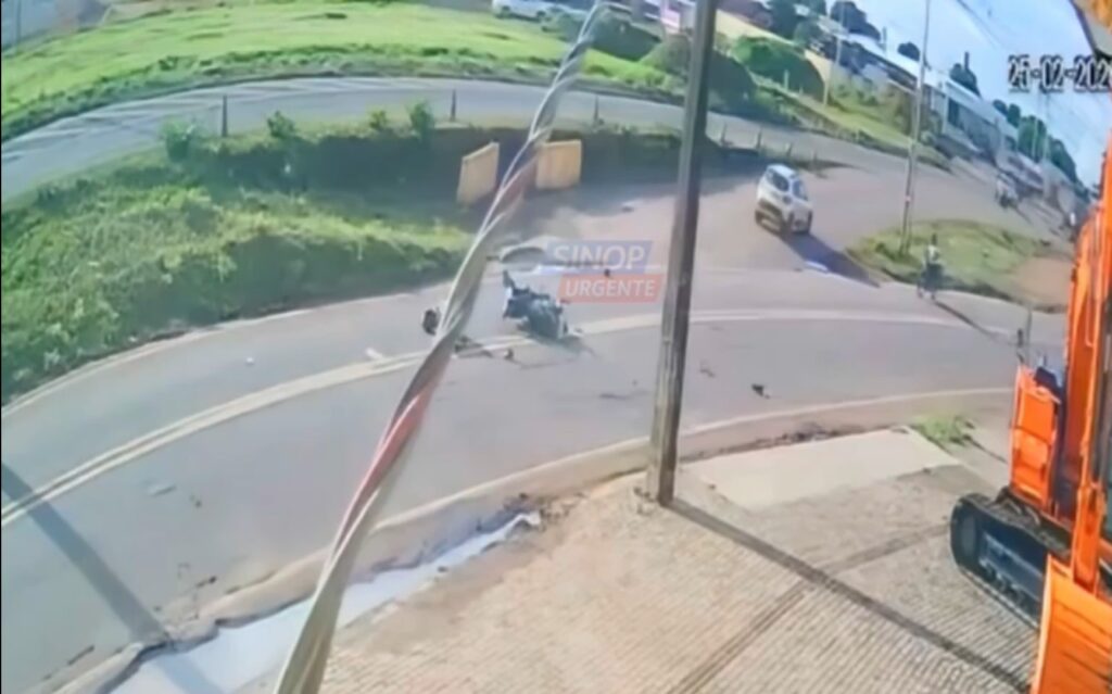 A câmera de segurança de um estabelecimento flagrou a colisão quase frontal entre um carro e uma moto. O veículo de passeio seguia pela João Pedro, sentido ao Camping Club, quando invadiu a pista contrária para poder ter acesso à BR-163. O motociclista não tem graves ferimentos e foi encaminhado à unidade de saúde. A PM foi ao local e registrou o boletim de ocorrência.