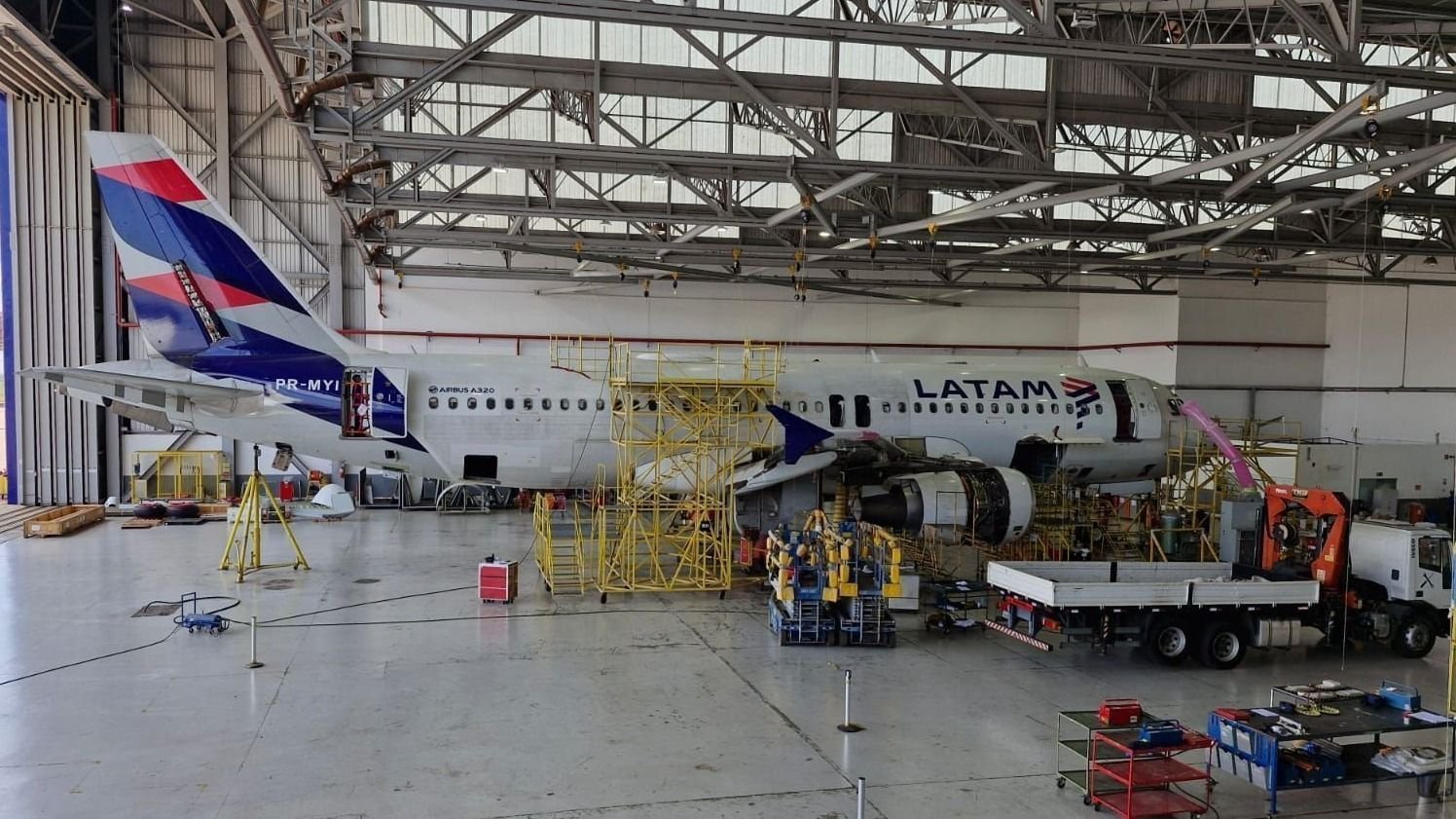 A parte da aeronave que ficou danificada com o impacto foi levada para o Latam MRO, onde foi recuperada e será pintada novamente. Veja como ficou:
